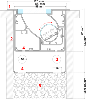 LASY BOX When installing the luminaire in the ground, it is important and essentiel to provide a proper stone drainage so that condensation can drain out. 1: Ground recessed LASYT luminaire 2: Stainless steel LASY BOX 3: Holes ø16mm for electrical tube 4: Drain holes so that condensation can drain out 5: Stone drainage minimum 100mm